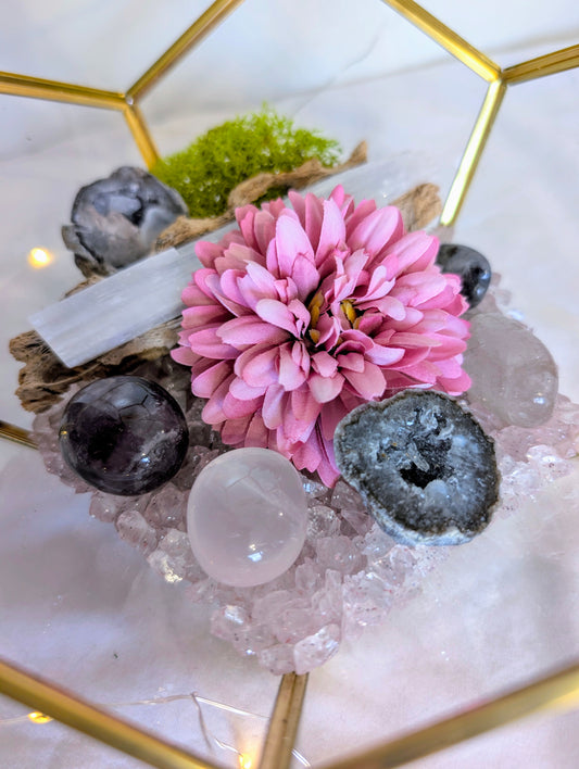 Bring the magic of crystals into your space with The Stepping Stones' handcrafted Crystal Geode Terrariums! Each terrarium is carefully designed to showcase the natural beauty and energy of crystal geodes, surrounded by decorative elements that enhance their vibrance.