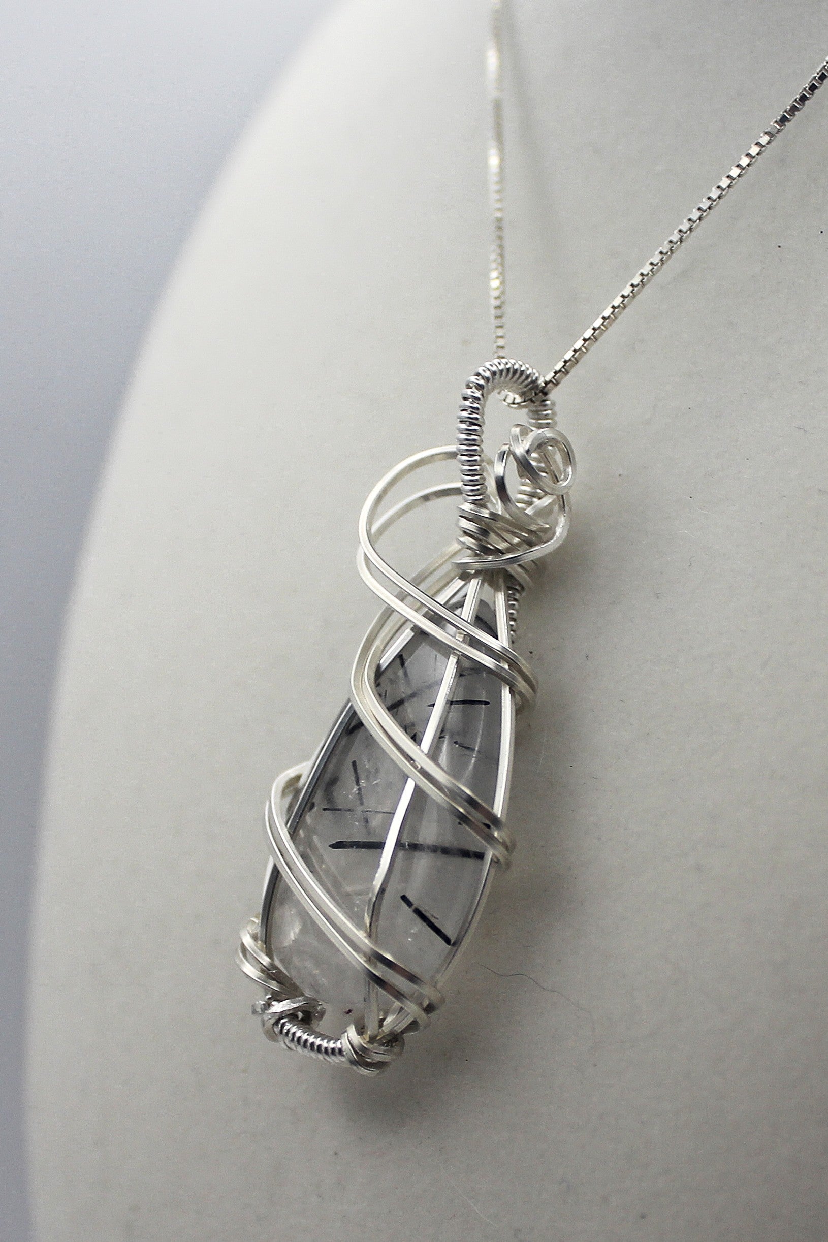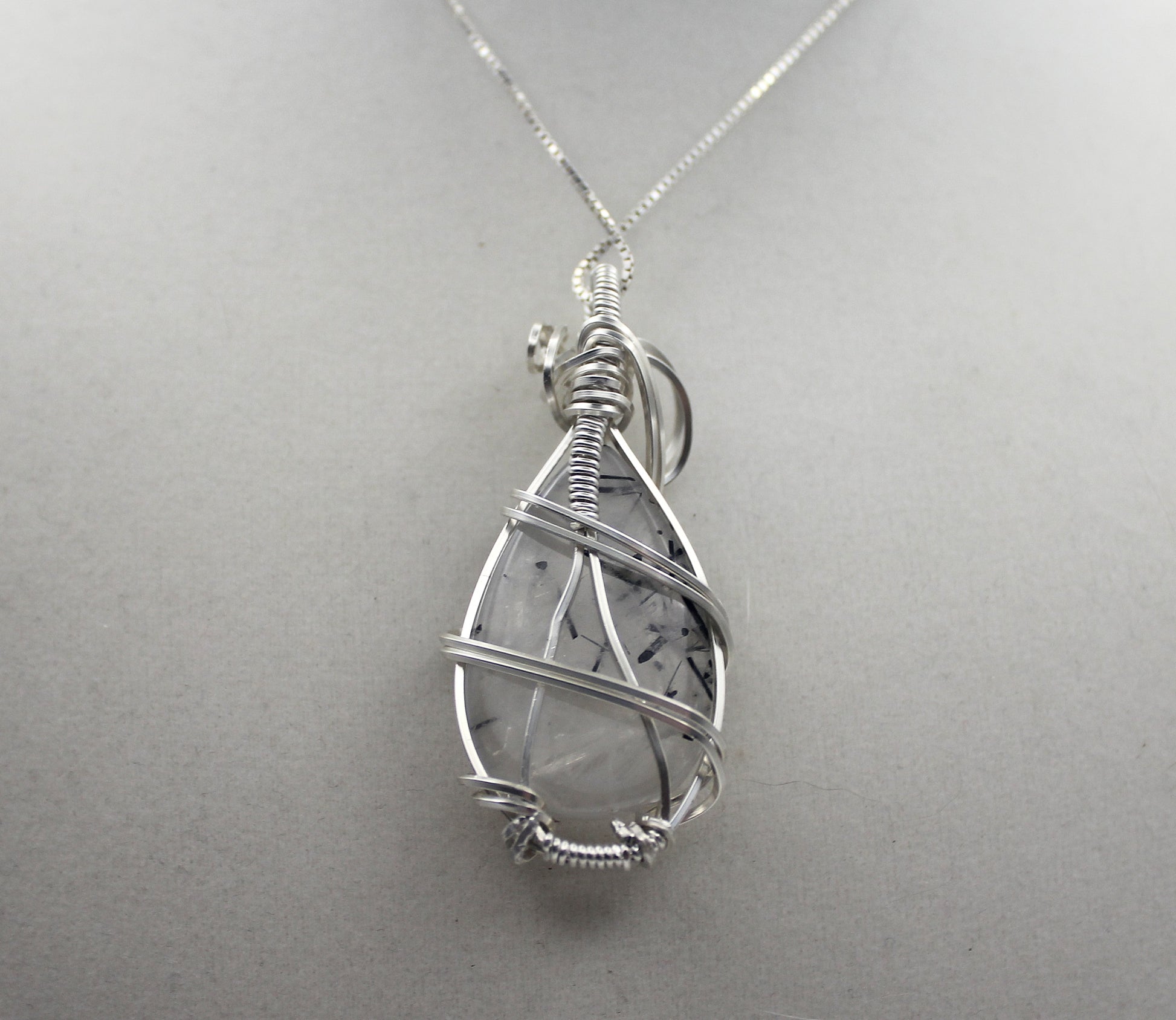 This one-of-a-kind pendant features a striking Black Rutilated Quartz teardrop, wrapped in bright, tarnish-resistant Argentium silver. Fine, needle-like strands of black rutile flash through the clear quartz, giving the piece a bold, modern energy while still feeling timeless and elegant. The hand-wrapped swirl design enhances the natural movement of the stone, creating a pendant that feels alive with intention.