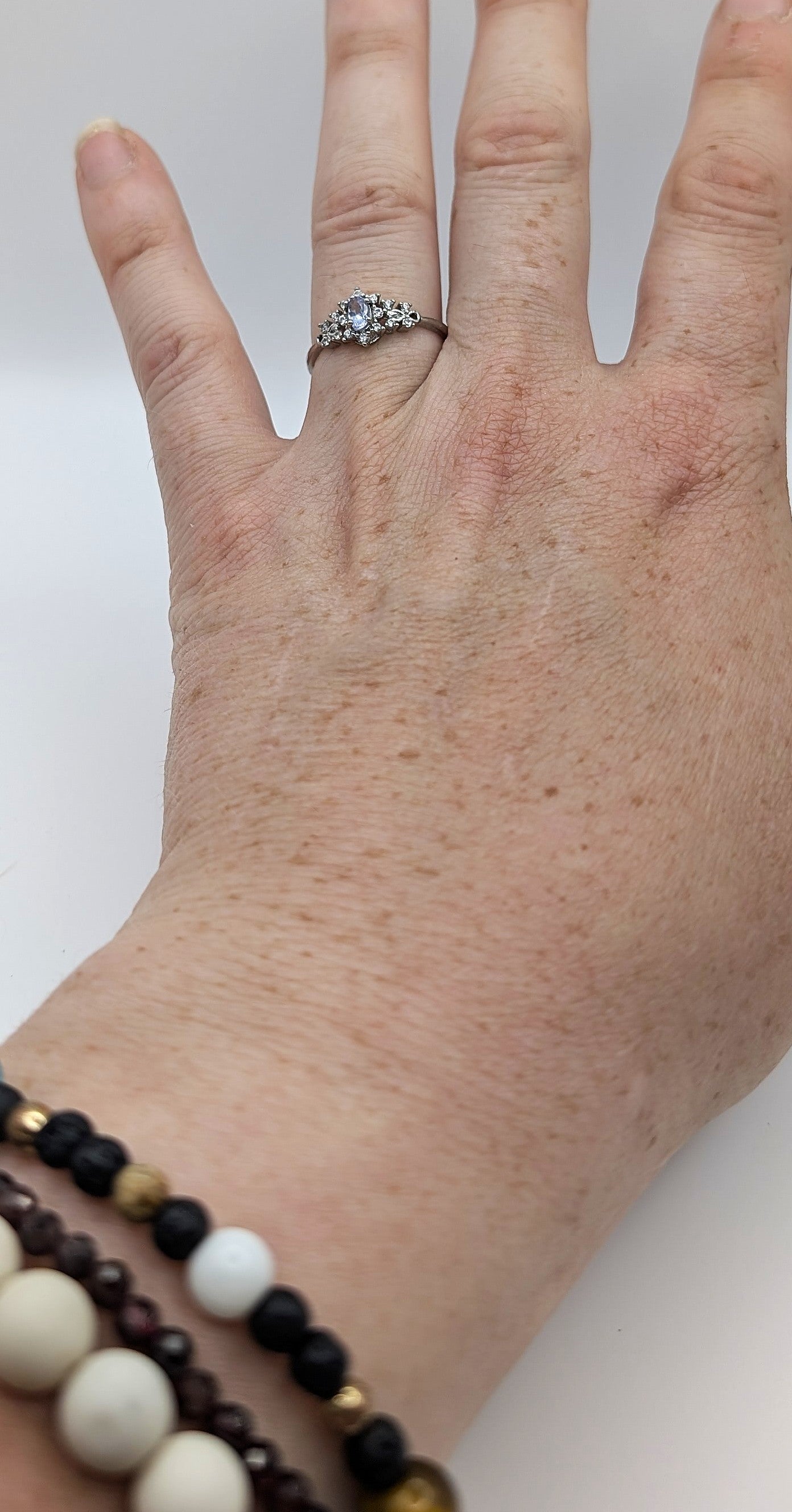 Add a touch of icy sparkle to your everyday style with this elegant silver-plated ring. Featuring a soft blue topaz center stone surrounded by brilliant white accent stones, this piece gives vintage fairy-princess energy without being over the top. The band is silver-color plated and fully adjustable for a comfortable fit.