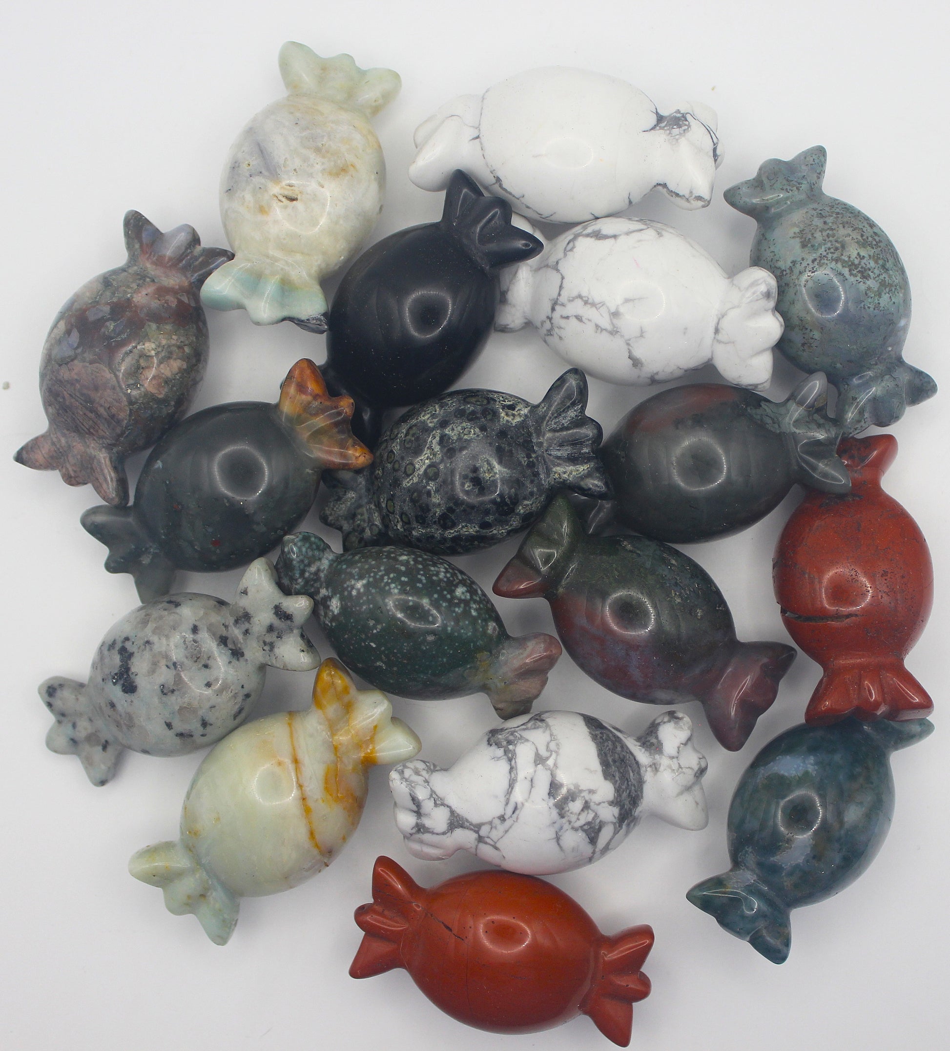 These adorable Crystal Candy carvings are a fun, unique addition to any crystal collection. Each piece is shaped like a wrapped piece of candy and carved from natural stone, giving every one its own personality, patterns, and colors.