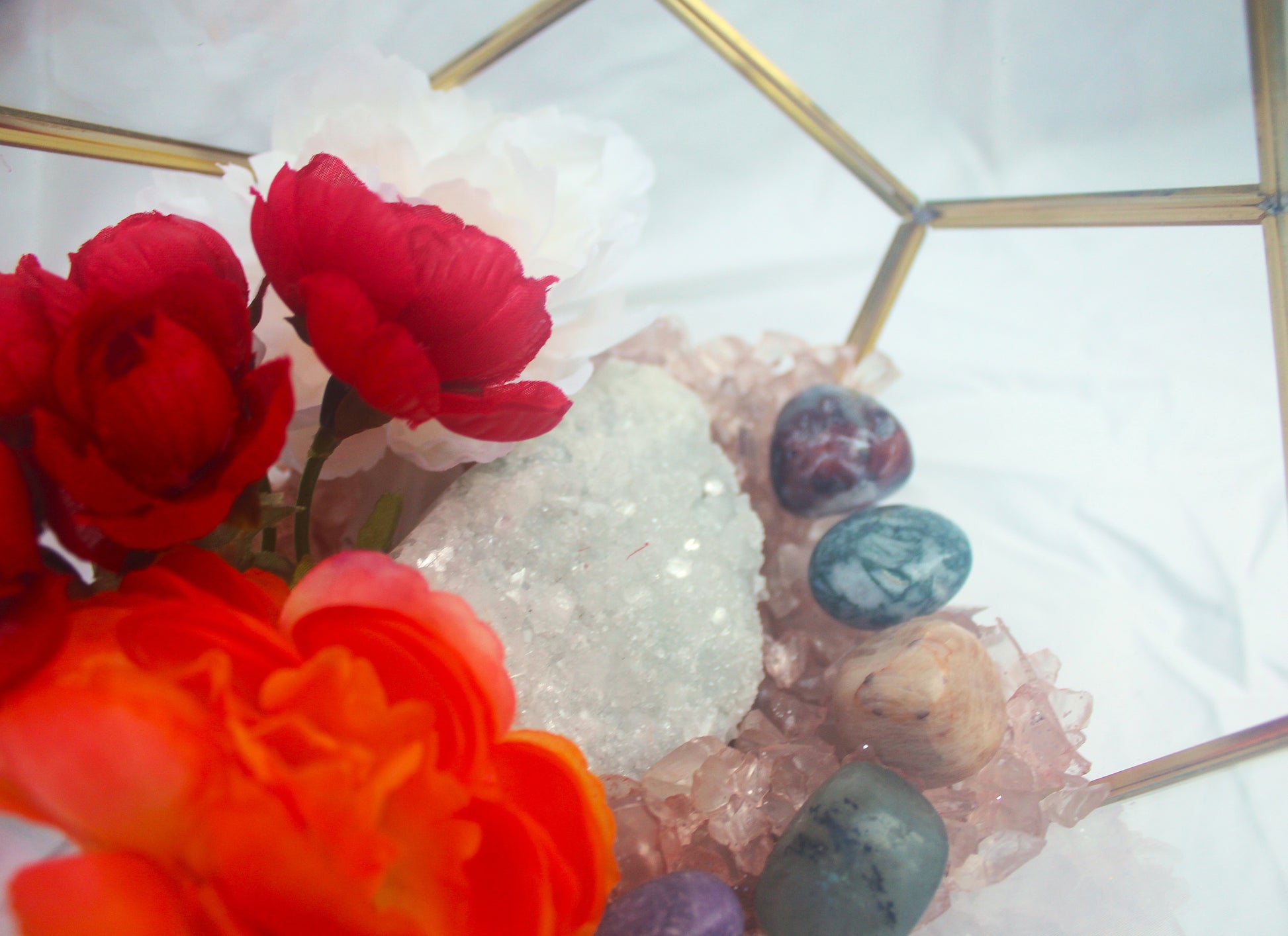 Paired with bold florals and a blend of supportive, intuition-based stones, this terrarium brings color, calm, and a touch of magic to any room. Each crystal was intentionally chosen to guide you through change, celebrate new beginnings, and reconnect you with joy, humor, and feminine strength.