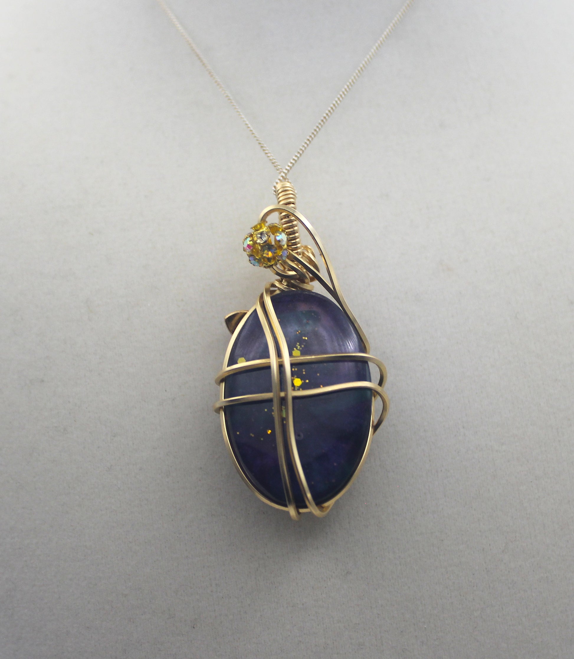 This handcrafted pendant features a deep purple resin cabochon encasing genuine malachite chips, creating a swirling blend of rich color and natural texture. Wrapped in genuine 14k gold-filled and 22k gold-plated wire, the piece balances elegance with an earthy, artistic feel.