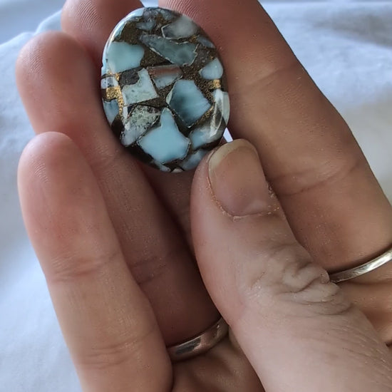 This rare cabochon features dreamy blue Larimar swirled with natural copper matrix, creating a breathtaking contrast of sea and spark. It’s like holding a piece of the Caribbean sky with molten magic running through it.