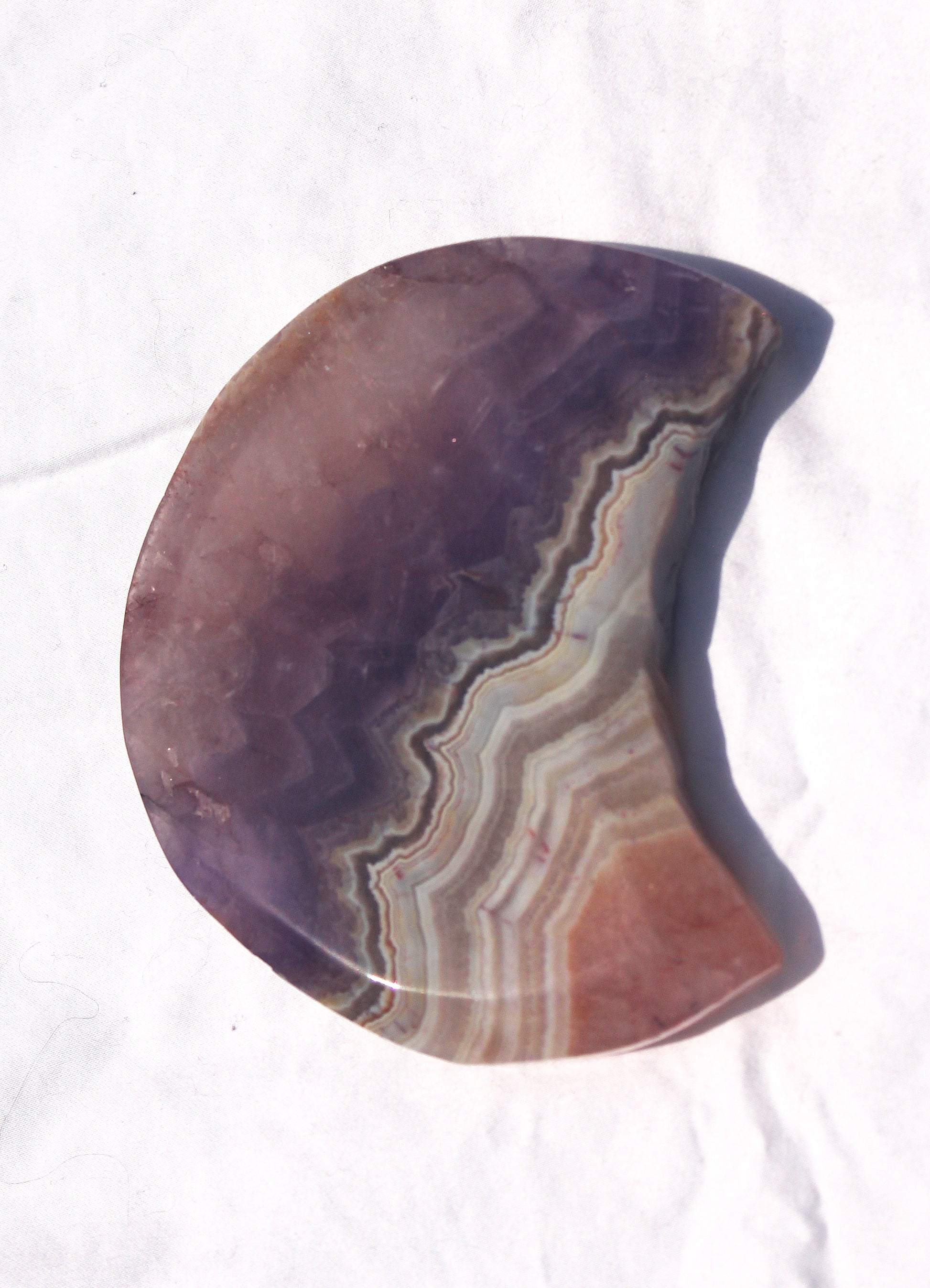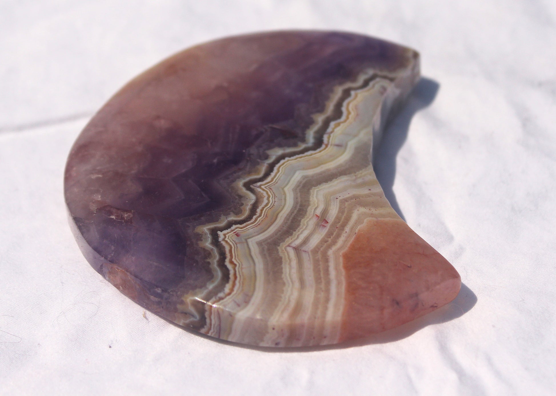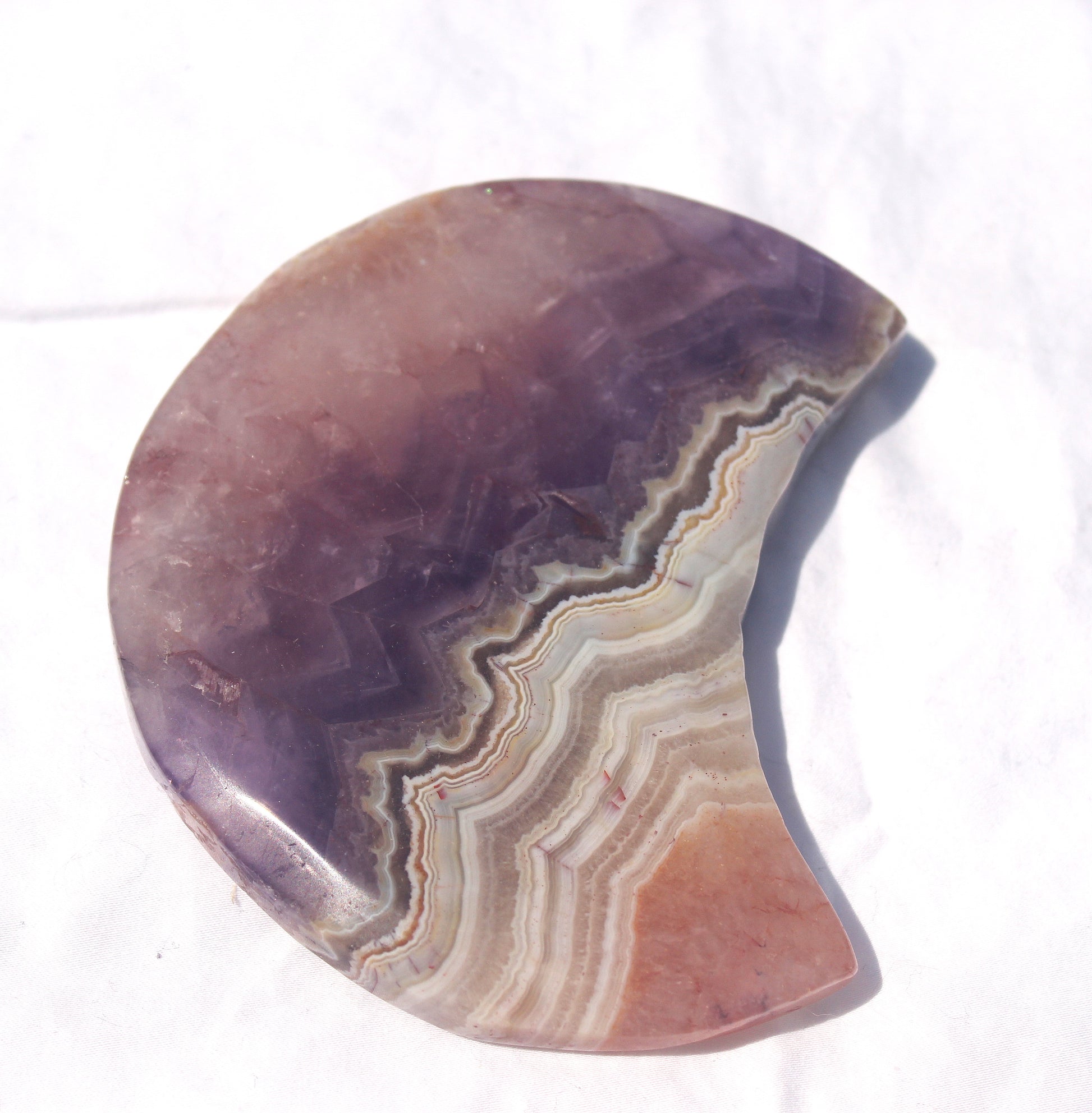 This captivating crescent moon carving brings together the natural beauty and energy of Amethyst, Pink Amethyst, and Crazy Lace Agate—each layer of stone adding depth, movement, and meaning. The blend of purple tones, delicate blush hues, and intricate banding makes this a truly one-of-a-kind piece of crystal art.