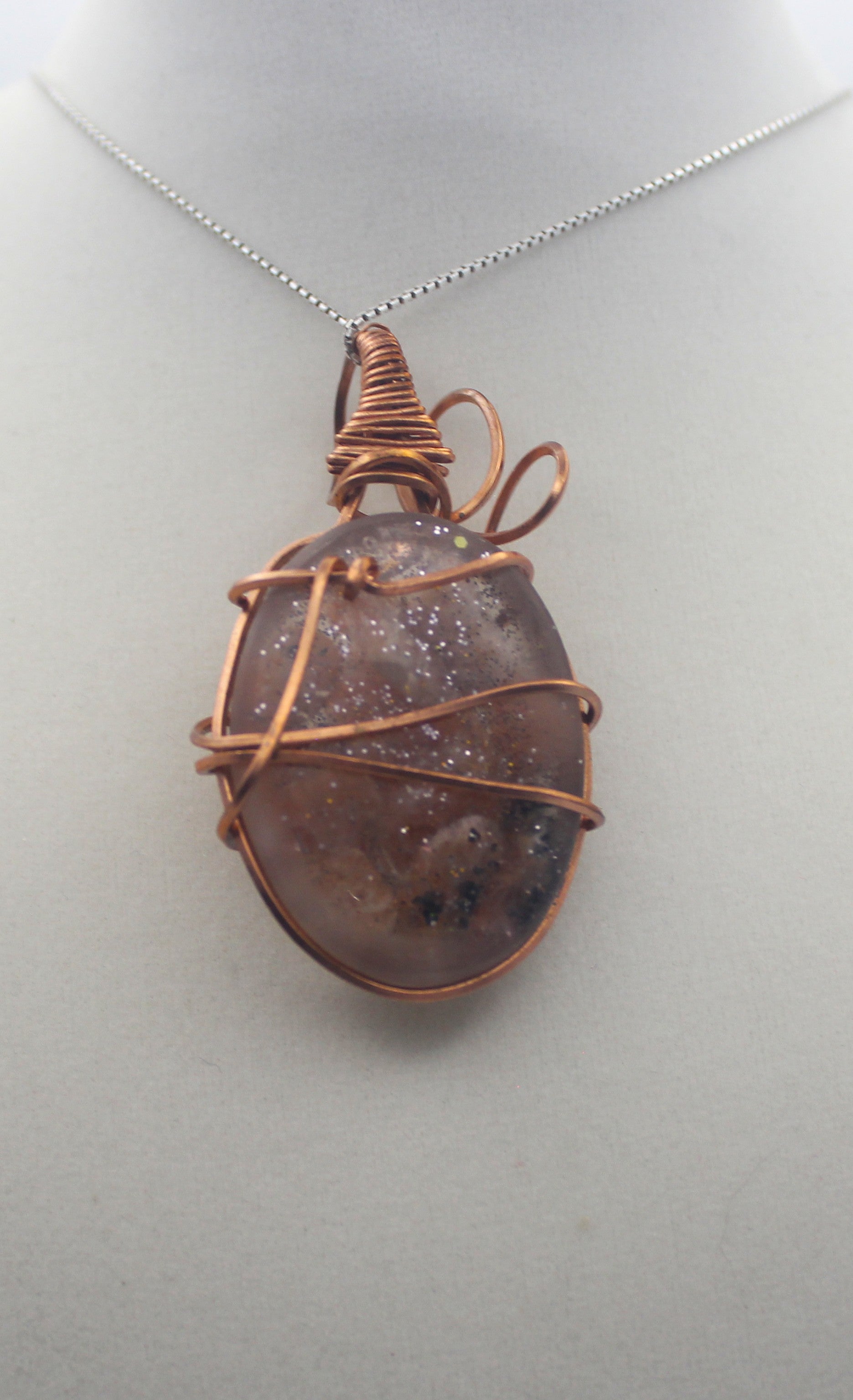 This handcrafted pendant features a shimmering resin cabochon infused with genuine Sunstone chips, wrapped in raw copper for an earthy, radiant finish. The warm tones of the copper complement Sunstone’s naturally uplifting energy, creating a piece that feels both grounding and energizing. Sunstone is often associated with joy, vitality, and personal empowerment—believed to brighten the spirit, spark confidence, and encourage a positive outlook.