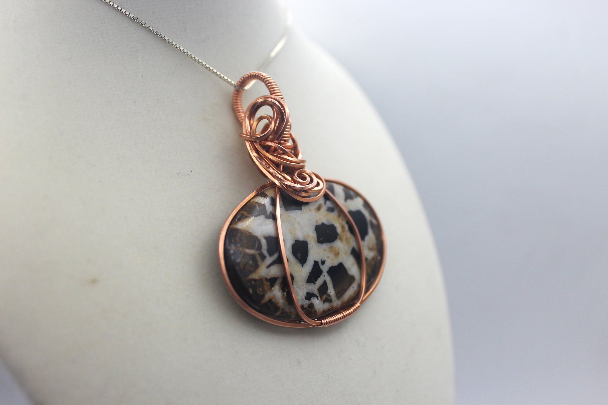 This Raw Copper Septarian Pendant features a substantial 2.25-inch stone, wrapped in hand-formed raw copper for a rugged aesthetic that stands out without trying too hard.
