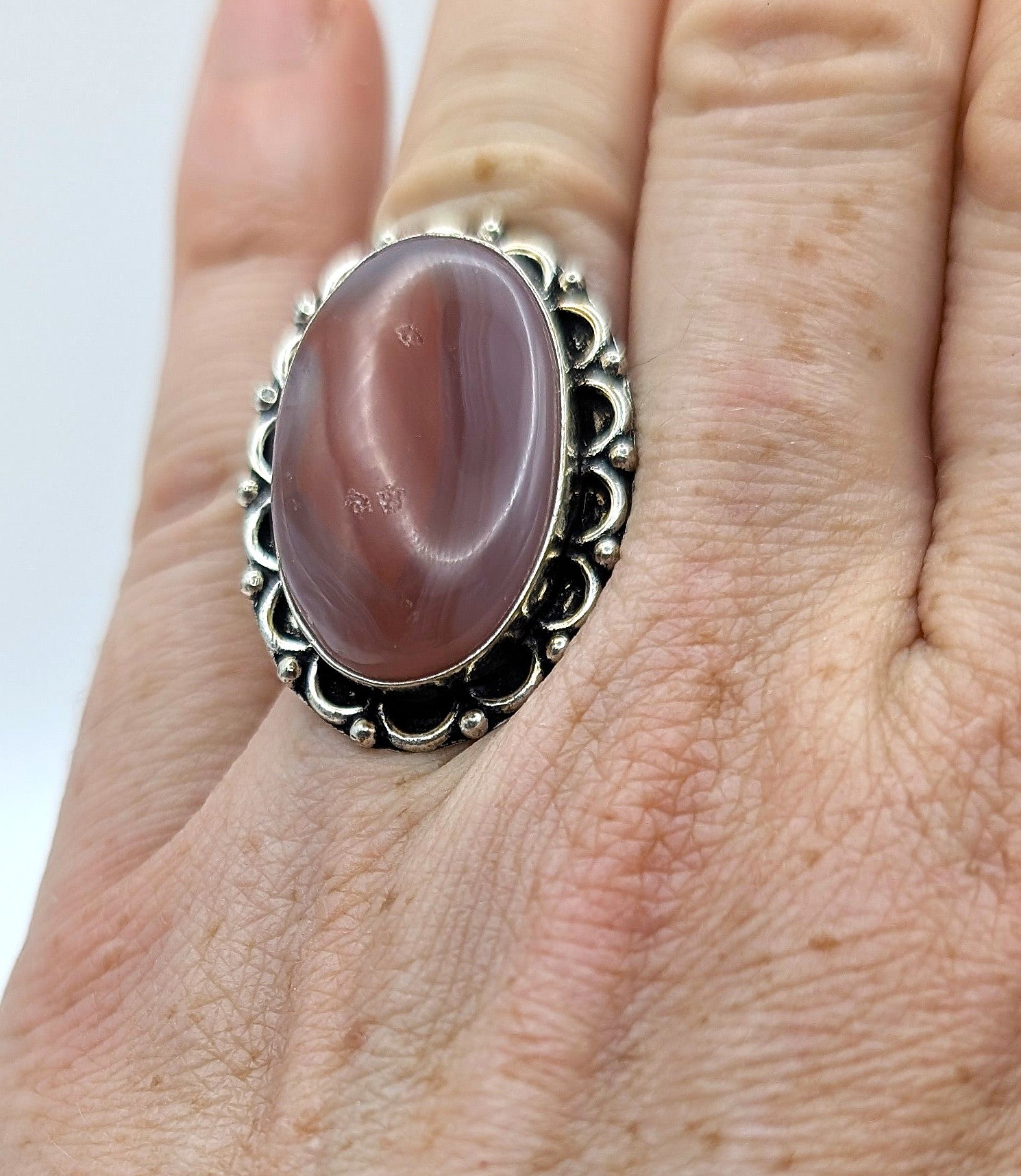 Make a bold, grounding statement with this striking Red Banded Agate ring. The large polished cabochon showcases natural flowing bands in warm reds and soft neutrals, wrapped in an ornate silver-color plated setting that gives it an elegant vintage feel. This piece is perfect for anyone who loves earthy tones, protective energy, and jewelry that stands out instantly.