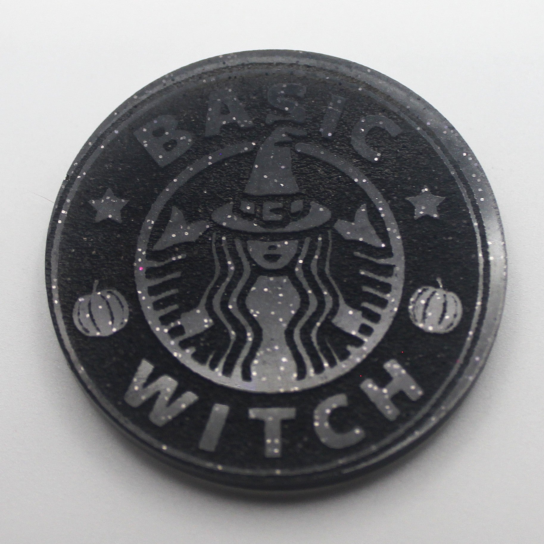 Cute, simple, and full of witchy attitude — the Resin “Basic Witch” charm is a fun little piece for anyone who loves embracing their magical side. With a subtle engraved design and a sparkly midnight finish, this charm is perfect for altars, décor, gifting, or collecting.