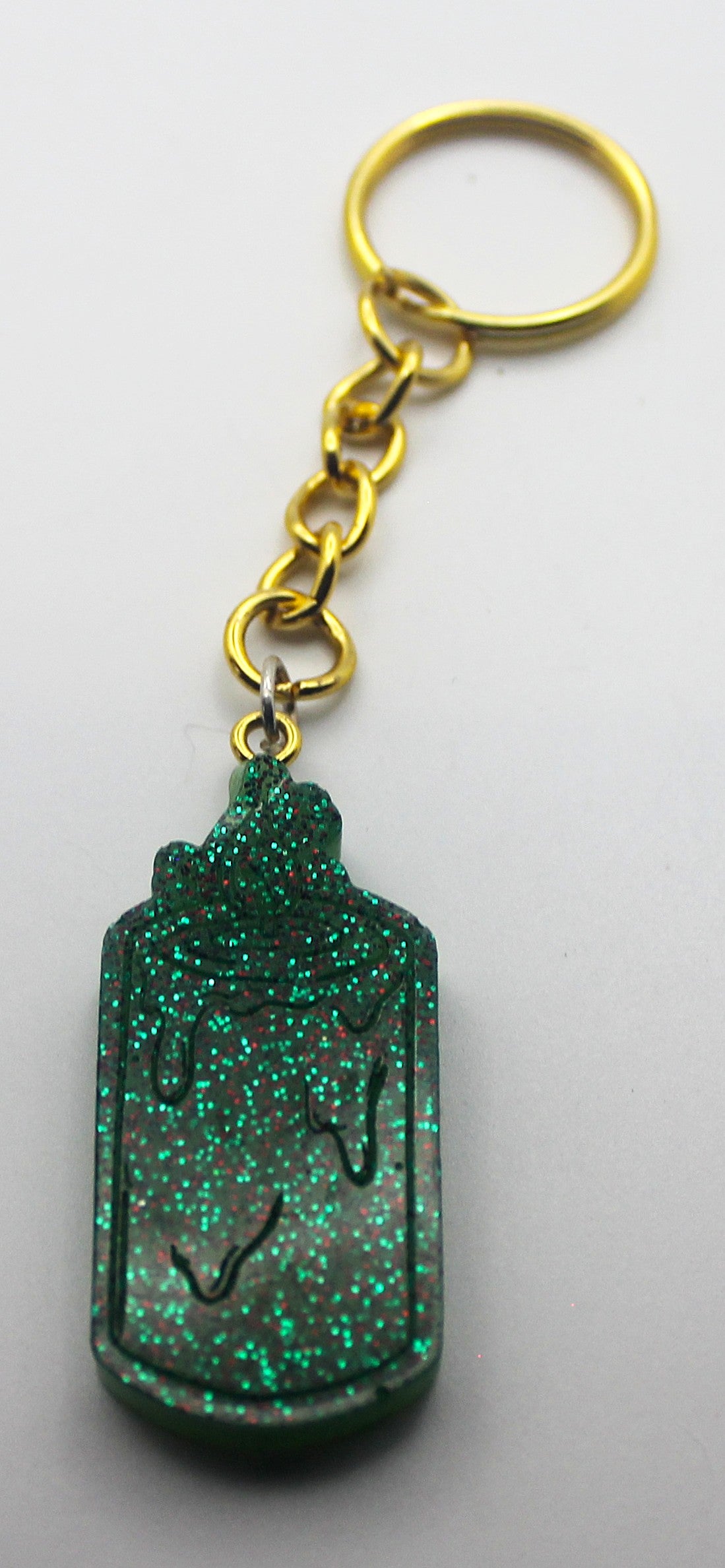 This Resin Candle Keychain features a dripping candle design hand-poured in a shimmering emerald green resin with twinkling glitter. Paired with a gold-tone chain and keyring, it adds a witchy, whimsical charm to any bag, lanyard, or key set.