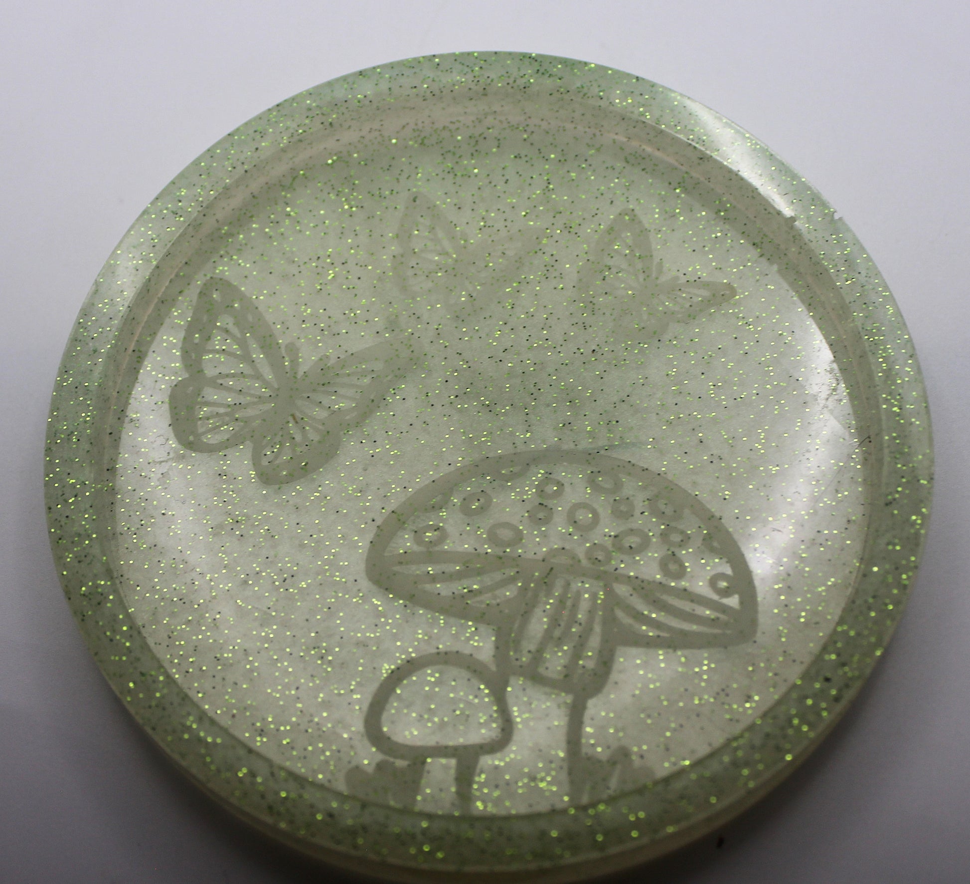 Bring a touch of forest magic into your home with this dreamy Mushroom Butterfly Trinket Tray. Soft green resin sprinkled with fairy-like glitter creates a gentle, earthy glow, while delicate mushrooms and fluttering butterflies are etched into the surface like secret woodland carvings.