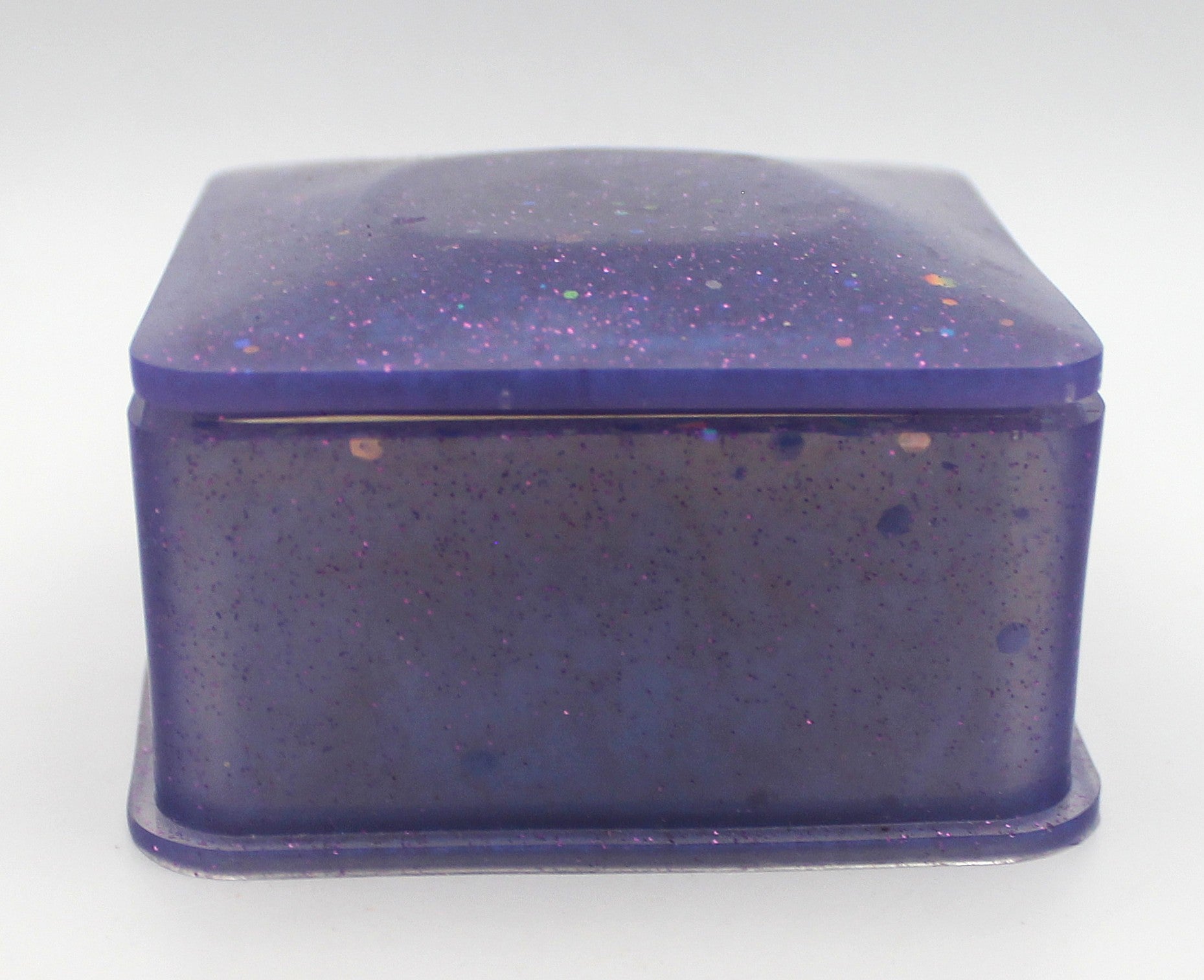 Keep your small treasures safe in this handcrafted resin square trinket box, designed for storing jewelry, tumbles, rings, crystals, herbs, and other keepsakes. Each box is made individually, giving it a smooth finish and eye-catching sparkle that stands out beautifully on any dresser, vanity, altar, or desk.