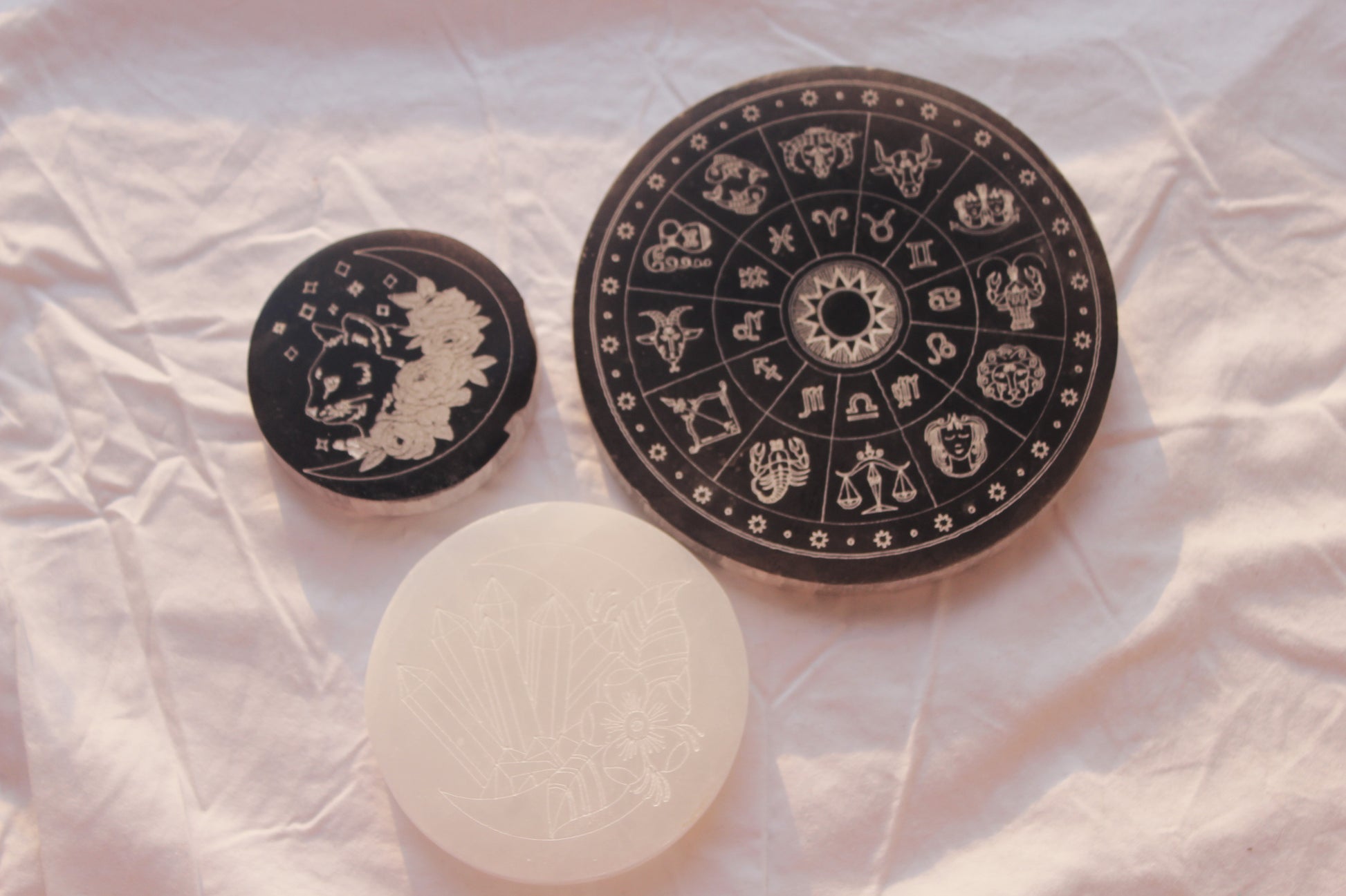 Channel cosmic energy with this bold black selenite plate, etched with the full zodiac wheel—featuring all 12 astrology signs orbiting a radiant sun at the center. This celestial stunner is ideal for crystal charging, tarot spreads, moon rituals, or simply adorning your altar with some serious star power.