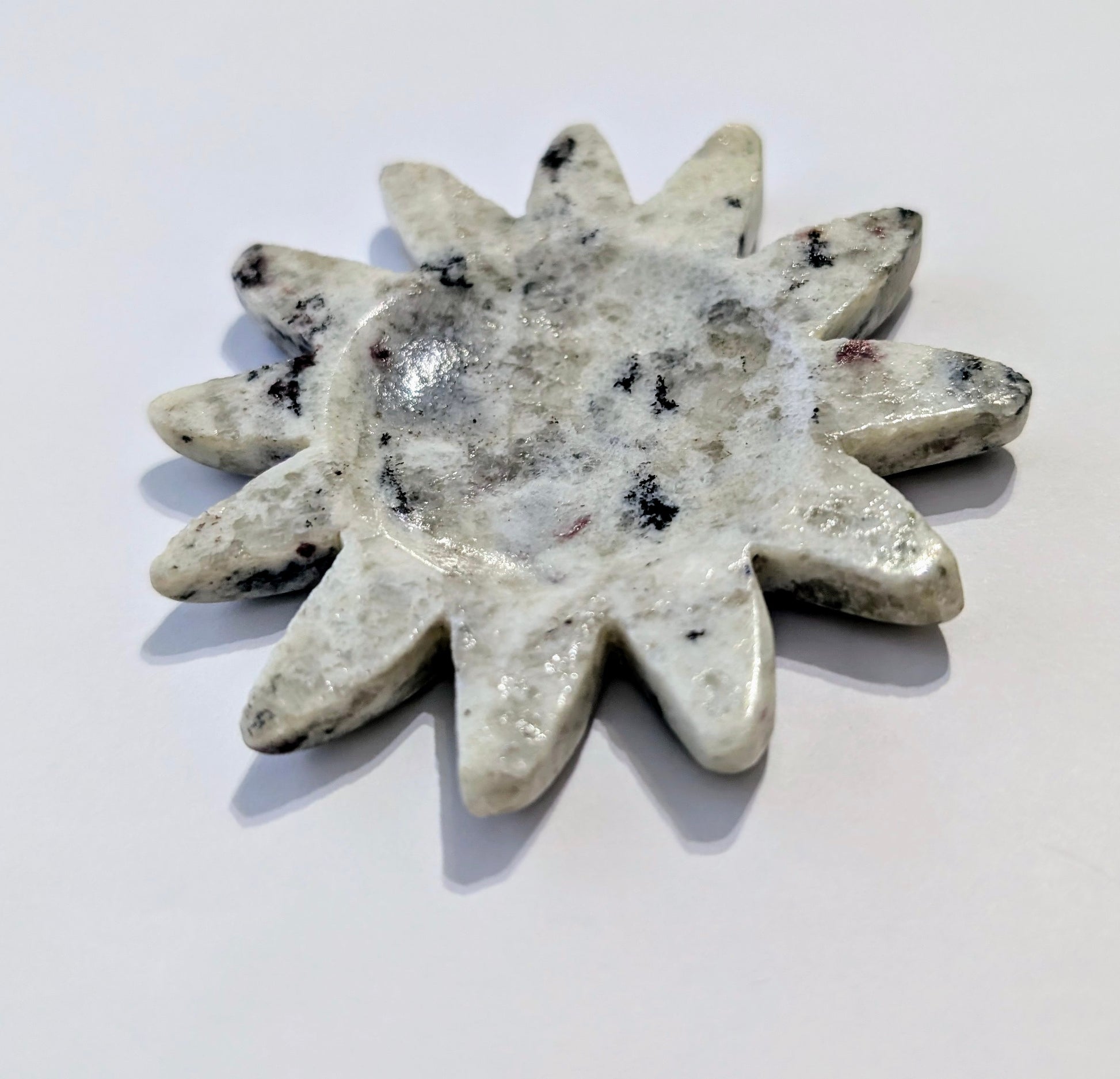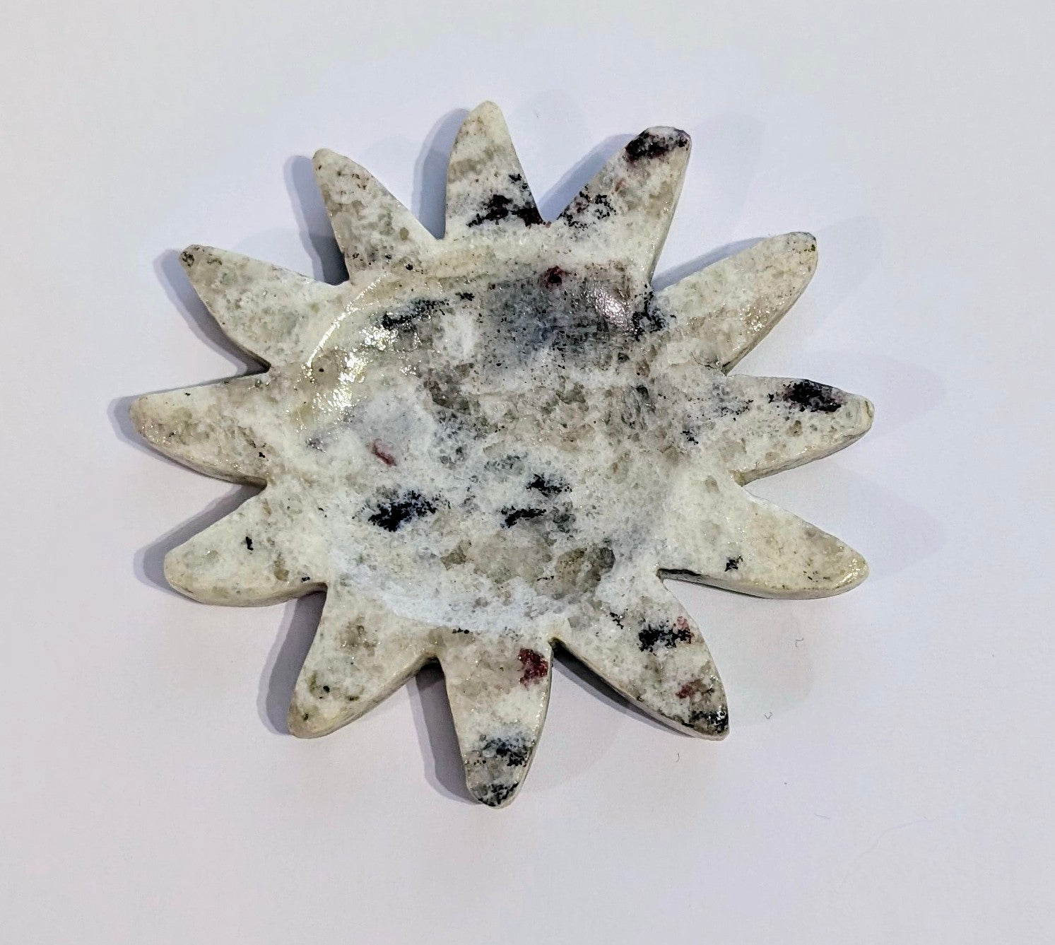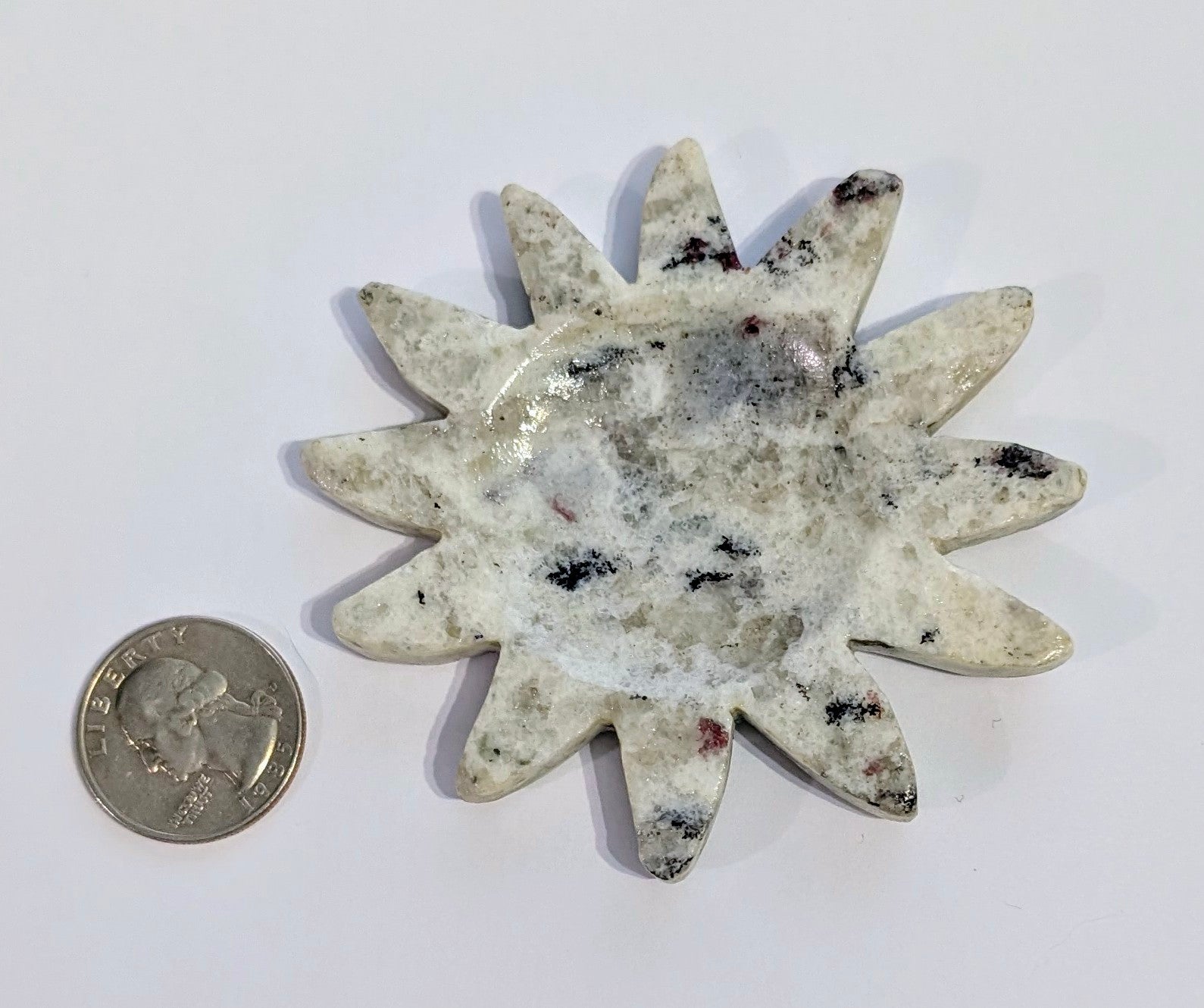 This radiant sun-shaped bowl is carved from a creamy white matrix stone scattered with striking inclusions of Rubellite Tourmaline—a rare pink variety known for its connection to the heart chakra, emotional healing, and unconditional love.