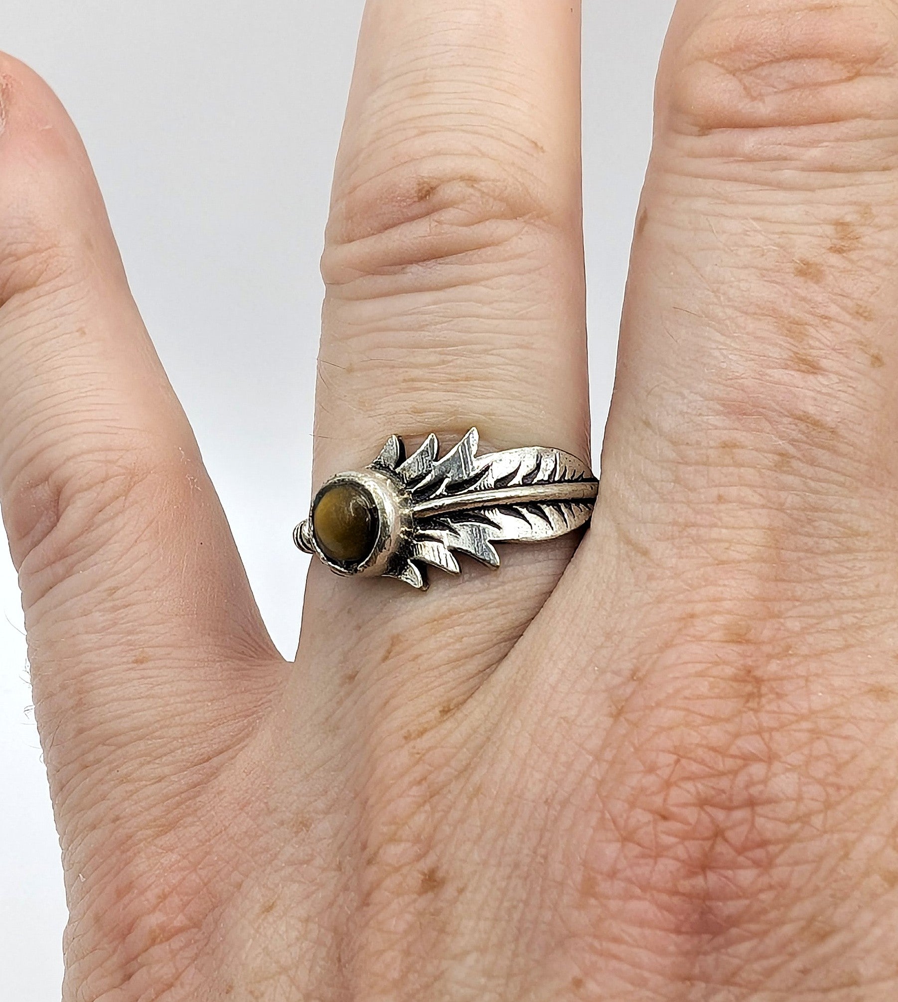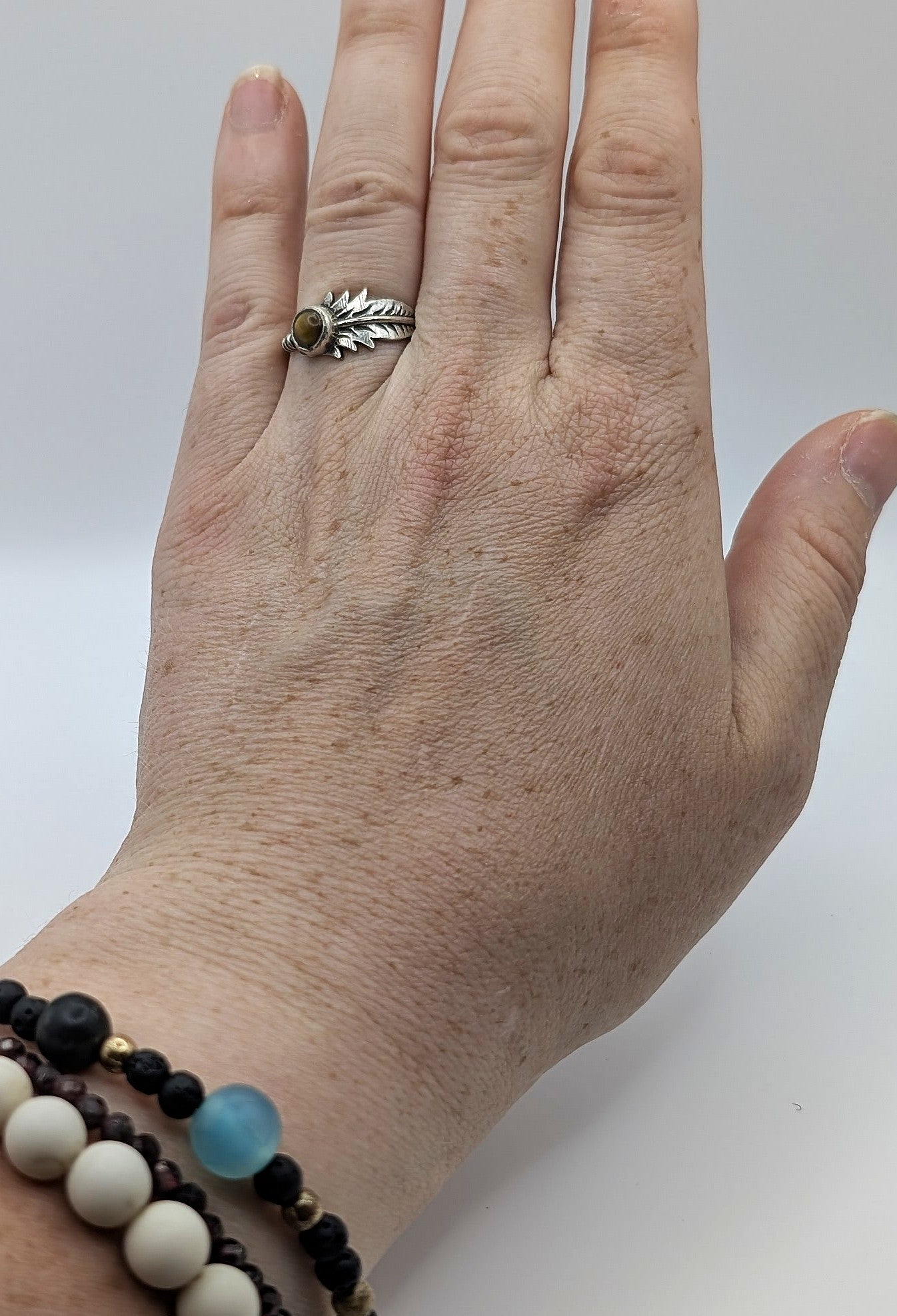 Channel grounded strength and earthy elegance with this Tiger’s Eye Feather Ring, crafted in a silver-color plated band with beautifully detailed feather motifs. The warm, shimmering Tiger’s Eye cabochon sits at the center like a protective talisman, catching the light with its signature golden chatoyancy.