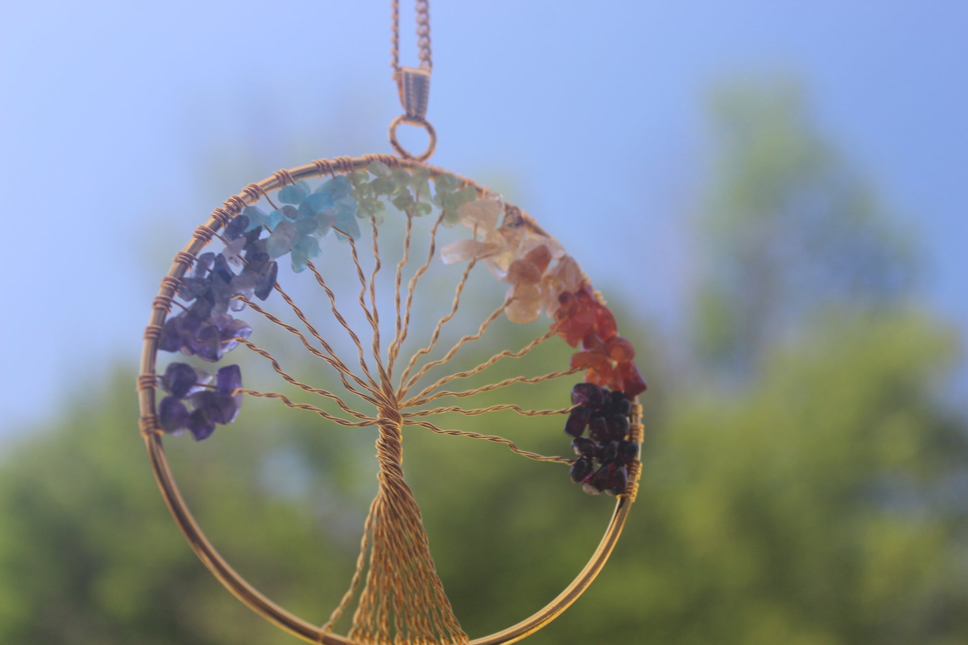 A symbol of balance, healing, and transformation, this Tree of Life chakra pendant brings together vibrant gemstone chips to align and support your energy centers.