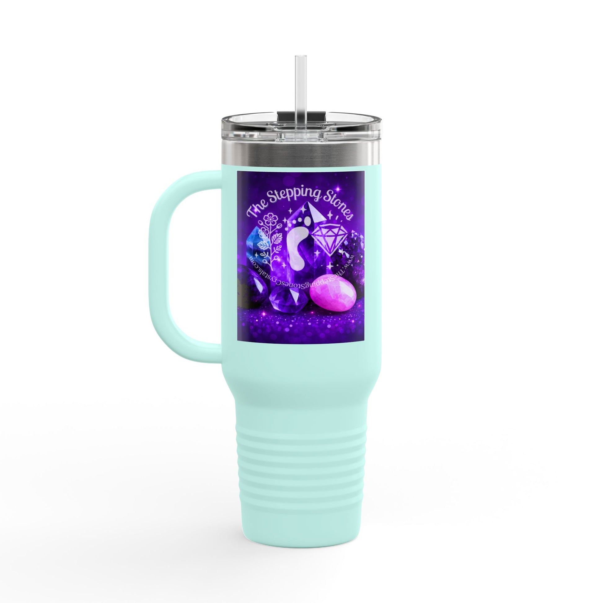 Sip in style with our 40oz Insulated Travel Mug, now featuring gorgeous purple crystal imagery and our signature Stepping Stones logo 💜✨